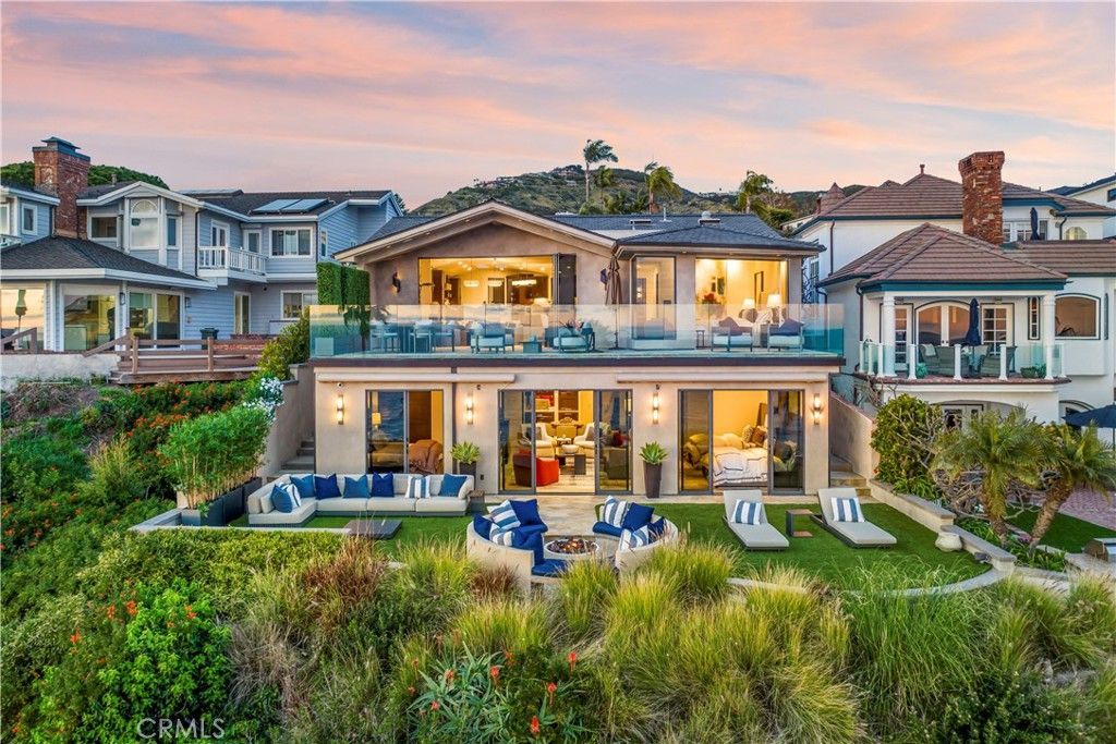 Experience the allure of South Lagunas coveted Three Arch Bay in this newly furnished contemporary bluff front home. A private, guard-gated community offers exclusive access to a private beach and community amenities. Designed by Brion Jeanette and completely rebuilt in 2013, this estate underwent a refreshing update in 2022. The well-thought-out floor plan includes a main-level master suite plus 4 bedrooms and a bonus room. Drive up the long driveway to find ample parking and a three-car garage with an elevator leading to the first level. The private gated entry welcomes you to an entertaining courtyard boasting a waterfall spa, fire pit, and outdoor kitchen with a built-in BBQ and teppanyaki grill. A guest casita with a separate entry and a fully equipped home office enhance the propertys versatility. Glass double doors lead to the main level, showcasing expansive floor-to-ceiling Pacific Ocean views. Revel in the master suite with new hardwood floors, a walk-in closet, and a marble master bath with a steam shower. The main level also features a guest bath, a fully equipped kitchen with state-of-the-art appliances, a dining room, and a living room with a built-in bar. Bi-fold glass doors open onto the oversized deck, creating a seamless indoor/outdoor living space where you can watch dolphins, enjoy sunsets, or keep an eye on the kids playing below on the private beach. Descending to the lower level reveals two more ensuite bedrooms with ocean views, a bonus room, laundry, guest bath, and an entertainment/media area with a kitchenette/bar. This level opens onto the generous lower rear lawn with a fire pit, built-in seating, and electronic sunshades. Beach access is just steps away. The property is offered fully furnished with brand-new furnishings and a refreshed interior, making it the ideal home youve been anticipating.